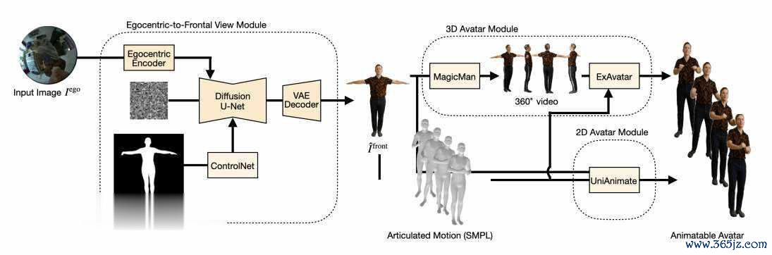 受SiTH和MagicMan等从正面图像进行360度重建的秩序的启发,索尼团队引入了一个管说念,使用ControlNet和褂讪扩散骨干从装束的从上至下图像生成传神的正面视图。团队的倡导是将单个从上至下的以自中心的图像诊疗为实验的正面暗示,并将其输入到图像-怒放模子中。这使得从最小的输入生成的化身怒放,铺平了说念路,更易于拜谒和通用的汉典呈现系统。
